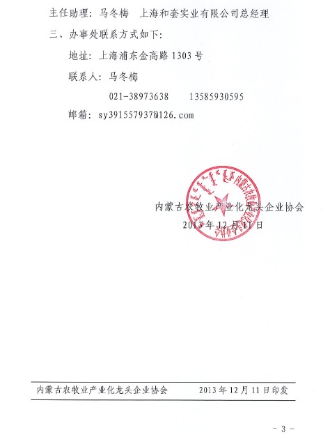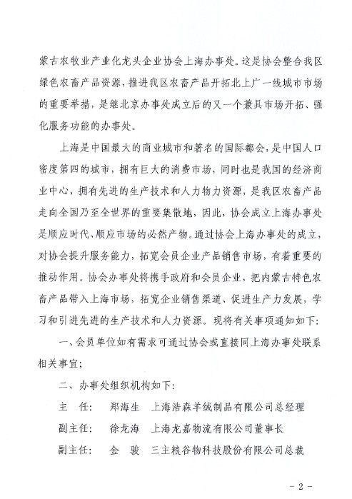 關于內蒙古農牧業(yè)產業(yè)化龍頭企業(yè)協(xié)會成立上海辦事處的通知