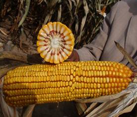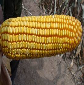 春播區(qū)從出苗至成熟126天。株型半緊湊,莖桿“之”字型程度弱,葉片上沖直立,葉色深綠,莖桿粗壯,氣生根發(fā)達(dá),高抗倒伏。株高265-270cm,穗位85cm。果穗長(zhǎng)筒型,穗長(zhǎng)24 cm,穗粗4.2 cm,左右,穗行數(shù)14-16行,紅軸,籽粒橙黃色,馬齒型。高抗黑粉病,抗絲黑穗病、大斑病、莖腐病,抗玉米螟及紅蜘蛛。在高產(chǎn)攻關(guān)試驗(yàn)中,產(chǎn)量可達(dá)1000 kg/667m2。