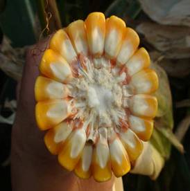 春播區(qū)從出苗至成熟126天左右。株型緊湊,株高271-286cm,穗位96cm。穗行數(shù)16-18 行,紅軸,果穗整齊、均勻;出籽率高達(dá)90%,軸細(xì)、粒深;長(zhǎng)勢(shì)整齊一致,不空桿,產(chǎn) 量年度間差異小,穩(wěn)產(chǎn)性好。
