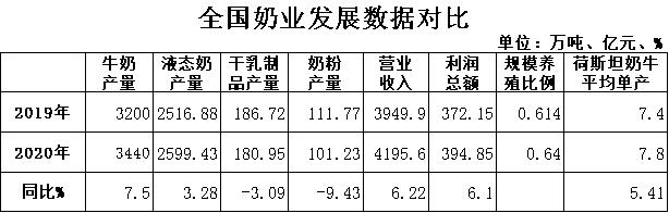 新冠肺炎疫情后,乳業(yè)成為逆勢增長的行業(yè)之一,乳企業(yè)績不斷好轉(zhuǎn),整個行業(yè)的利潤總額同比降幅不斷收窄,10月利潤總額增幅由負轉(zhuǎn)正,今年以來首次轉(zhuǎn)為正值。隨著消費者對健康飲食更加重視,乳業(yè)的未來發(fā)展會更好。根據(jù)國家統(tǒng)計局數(shù)據(jù),2020年全國液態(tài)奶產(chǎn)量2599.43萬噸,同比增長3.28%;全國干乳制品產(chǎn)量180.95萬噸,同比下降3.09%;全國奶粉產(chǎn)量101.23萬噸,同比下降9.43%,其中12月份產(chǎn)量10.15萬噸,同比下降1.41%。規(guī)模以上乳企主營業(yè)務(wù)收入4195.58億元,同比增長6.22%;利潤總額394.85億元,同比增長6.10%,利潤總額增幅轉(zhuǎn)正,銷售利潤率9.41%。奶業(yè)轉(zhuǎn)型升級加快推進。全國奶牛規(guī)模養(yǎng)殖比例達到64%,同比提高2.6個百分點。全國荷斯坦奶牛平均單產(chǎn)超過7.8噸,同比增長400千克。