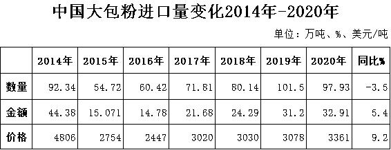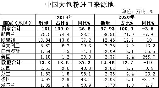 據(jù)中國海關(guān)統(tǒng)計,2020年進口大包粉97.93萬噸,同比-3.5%,進口額32.91億美元,同比+5.4%,均價3361美元/噸,同比+9.2%,主要來自新西蘭占71%、歐盟占12.7%、澳大利亞占7.9%。