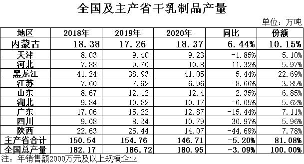 奶粉:根據(jù)國家統(tǒng)計局數(shù)據(jù),2020年全國奶粉產(chǎn)量101.23萬噸,同比下降9.43%,其中黑龍江產(chǎn)量40.01萬噸,同比增長3.02%,占總產(chǎn)量的39.52%,位居全國第一位;內(nèi)蒙古產(chǎn)量9.58萬噸,同比增長14.90%,占總產(chǎn)量的9.46%,位居全國第四位。